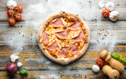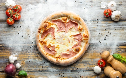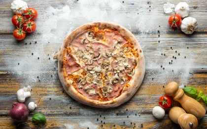 rajčatový základ, italská mozzarella, šunka od kosti, čerstvé žampiony