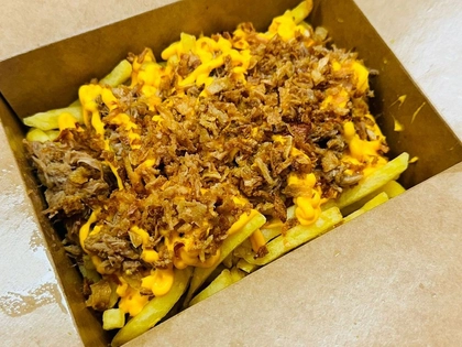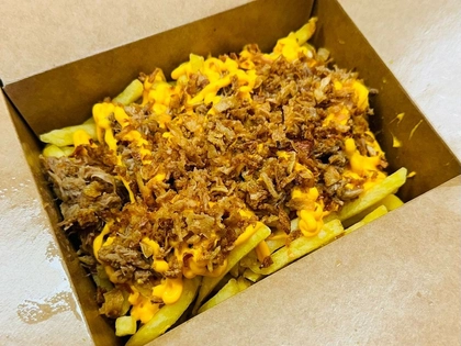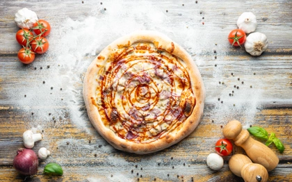 Barbecue omáčka, italská mozzarella, Chicago cheddar, bostonská slanina, čerstvá červená cibulka, detroitská kukuřice, texaské vejce, kostičky