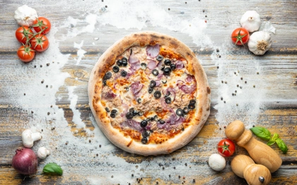 rajčatový základ, italská mozzarella, kousky lahodného tuňáka, čerstvá červená cibule, olivy