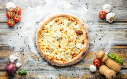smetanový základ, italská mozzarella, vyzrálá gorgonzola, sametové kopečky sýru ricotta, to vše posypané sýrem grana padano