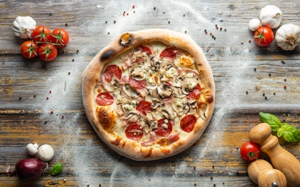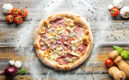 smetanový základ, italská mozzarella, salam, slanina, žampiony, niva