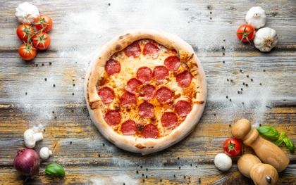 rajčatový základ, italská mozzarella, italský salám padano napůl s klasickým salámem
