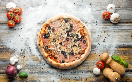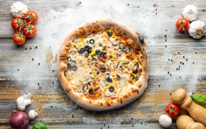 Rajčatový základ, italská mozzarella, čerstvé žampiony, černé olivy, kukuřice a nasekaná bazalka zasypané sýrem Grana Padano