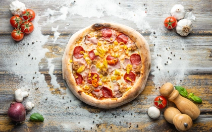 rajčatový základ, italská mozzarella, šunka od kosti, ananas