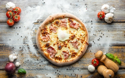 rajčatový základ, italská mozzarella, plátky slaniny, čerstvá červená cibule, vejce