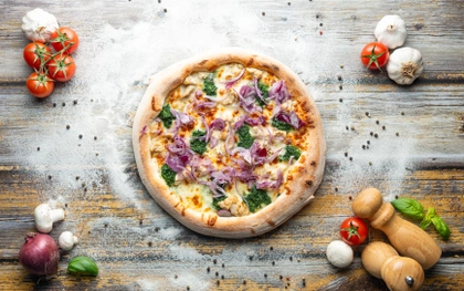 smetanový základ, italská mozzarella, kostičky kuřecích prsou, čerstvá červená cibule, špenátové kopečky