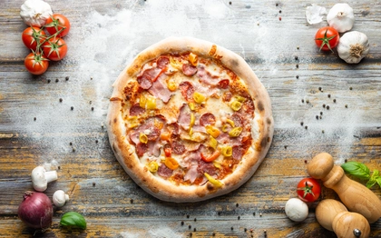 Rajčatový základ, italská mozzarella, šunka od kosti, kukuřice, vejce
