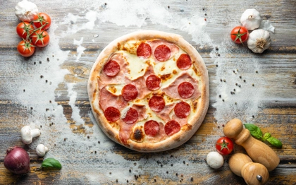 smetanový základ, italská mozzarella, šunka od kosti, salám