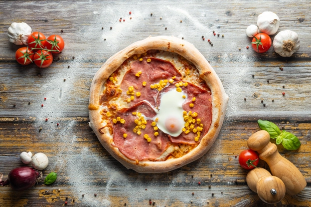 Rajčatový základ, italská mozzarella, šunka od kosti, kukuřice, vejce