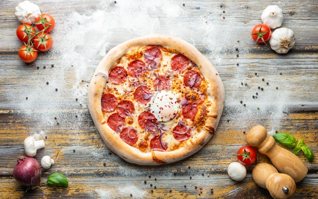 rajčatový základ, italská mozzarella, salám, sušené chilli, čerstvá červená cibule, vejce