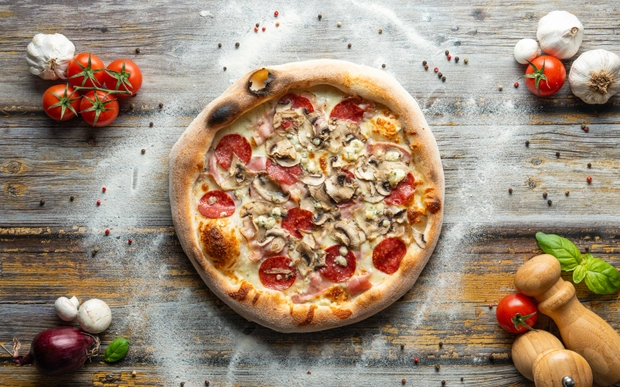 rajčatový základ, italská mozzarella, plátky slaniny, salám, čerstvé žampiony