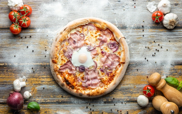 rajčatový základ, italská mozzarella, plátky slaniny, čerstvá červená cibule, vejce