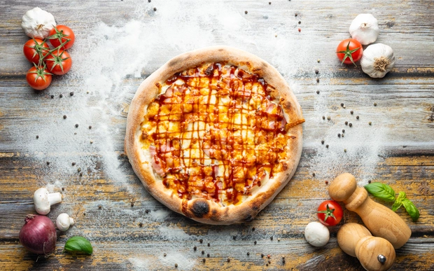 Barbecue omáčka, italská mozzarella, Chicago cheddar, bostonská slanina, čerstvá červená cibulka, detroitská kukuřice, texaské vejce, kostičky