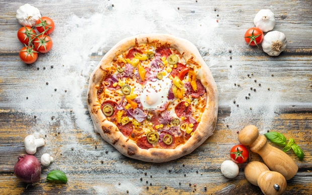Rajčatový základ, italská mozzarella, šunka od kosti, kukuřice, vejce