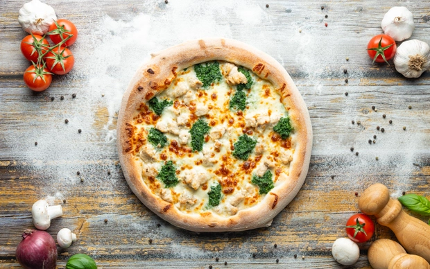 smetanový základ, italská mozzarella, kostičky kuřecích prsou, čerstvá červená cibule, špenátové kopečky