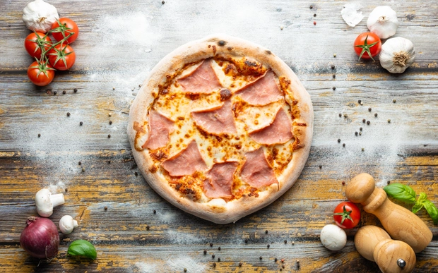 Rajčatový základ, italská mozzarella, šunka od kosti, kukuřice, vejce